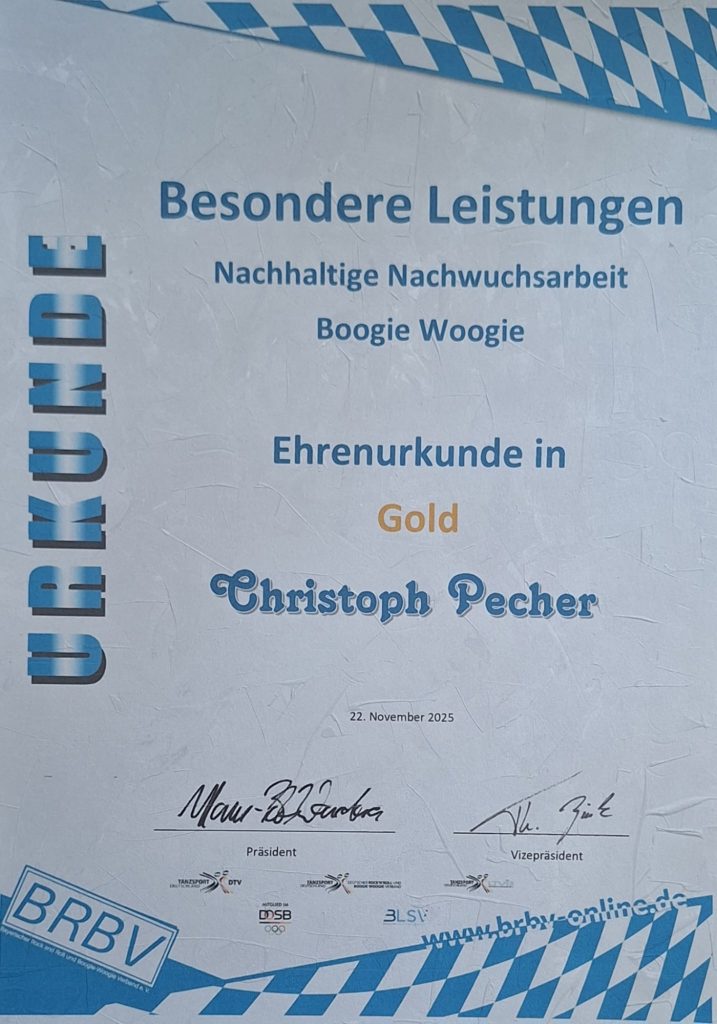 Im Rahmen der Bayerischen Meisterschaften 2025 wurde Christoph Pecher vom Bayerischen Rock’n’Roll und Boogie Woogie Verband mit der EHRENURKUNDE IN GOLD für sein herausragendes Engagement und seine jahrelange Arbeit für die Boogie Woogie Kinder und Jugend ausgezeichnet.